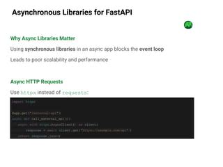 One of the most common use cases for asynchronous programming in web development is handling database operations. Traditional synchronous database libraries can block the main thread while waiting for queries to complete, leading to performance bottlenecks. To avoid this, you can use asynchronous database libraries that allow you to perform database operations without blocking the main thread. For example, you can use asyncpg for PostgreSQL or motor for MongoDB. Here’s an example of how to use asyncpg with FastAPI: