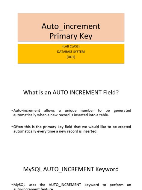 • Always define a primary key: Ensure that your auto-incrementing column is defined as the primary key ( PRIMARY KEY ). This ensures uniqueness and helps with data integrity.