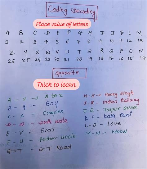 • Reverse Alphabetical Order: Similarly, being familiar with the reverse alphabetical order (Z=1, Y=2, …, A=26) can be incredibly useful, especially when dealing with reverse coding patterns. Some questions might directly use this order as the basis for the code.