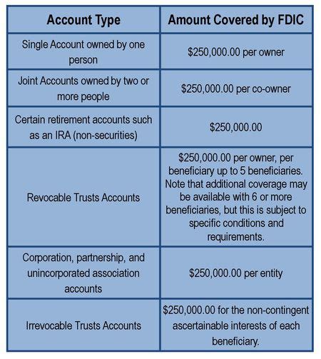 Alright, here’s the million-dollar question: how does FDIC insurance actually work? Is it per account or per individual ? The answer, my friends, is per individual, not per account (at a single bank). This is a critical distinction that can seriously impact how you manage your finances. Imagine you have a checking account and a savings account at the same bank, with \(200,000 in each. If the bank fails, you're *still* fully covered because the total amount (\) 400,000) does not exceed the \(250,000 limit. The FDIC protects each depositor up to \) 250,000 per insured bank, taking into account all of the individual’s deposit accounts at that bank. If, however, you have more than \(250,000 at a single bank, any excess is not insured. Thus, it’s not as simple as opening multiple accounts at the same bank to get around the limits. The FDIC looks at the individual, not just the account. This can trip up a lot of people! Understanding how the FDIC calculates coverage is extremely important for those with significant savings. This can often be achieved through various account structures and types of ownership. For example, joint accounts, trust accounts, and retirement accounts can affect coverage limits. This is also why having accounts at different banks can provide additional protection, because the \) 250,000 limit applies separately at each insured bank. If you’re a high-net-worth individual or someone who just has a lot of savings, it’s wise to spread out your deposits across different financial institutions to make sure your money is fully insured. This also diversifies your risk. Keep in mind that FDIC insurance only covers deposits at banks and savings associations. Other types of financial institutions, like credit unions, are insured by the National Credit Union Administration (NCUA), which works similarly to the FDIC.