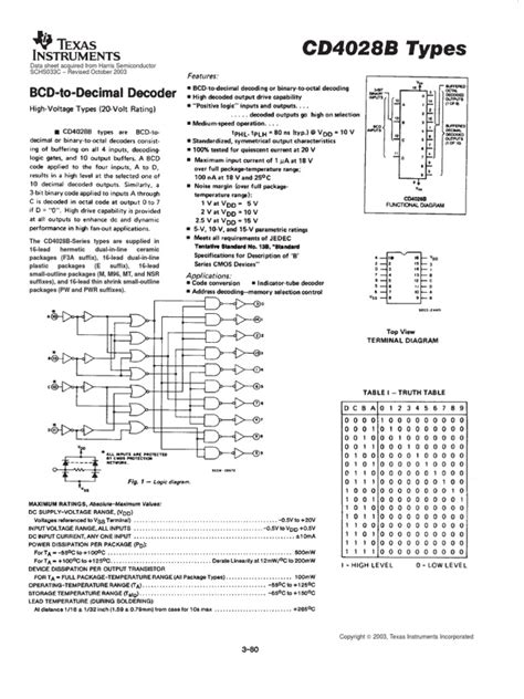 Following that, you’ll almost always find a Truth Table . For the IC 4028, this table is gold. It systematically shows every possible BCD input combination (0000 to 1001) and indicates which of the ten output pins (Q0-Q9) will be active (HIGH) for each input. It visually confirms the decoding function and helps you plan your logic. It might also show the behavior for invalid BCD inputs (1010-1111), which is good to know.