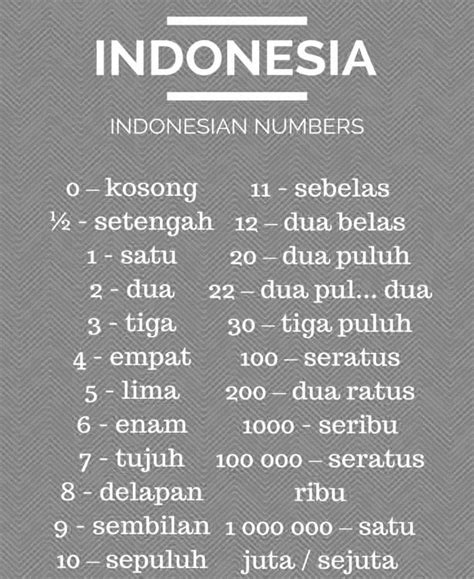Understanding the Structure: Just like with the tens, you combine the number with the word for the place value. So, “dua ratus” is “two hundred,” and “tiga ribu” is “three thousand.” When you get to 10,000, it’s “sepuluh ribu” (ten thousand), and 100,000 is “seratus ribu” (one hundred thousand). And finally, a million is “satu juta.” To say larger numbers, you just combine these elements. For example, 1,250 would be “ seribu dua ratus lima puluh ” (one thousand two hundred fifty). It might seem daunting at first, but once you break it down into its components, it becomes much more manageable. Practice with different numbers and soon you’ll be counting in Indonesian like a champ!