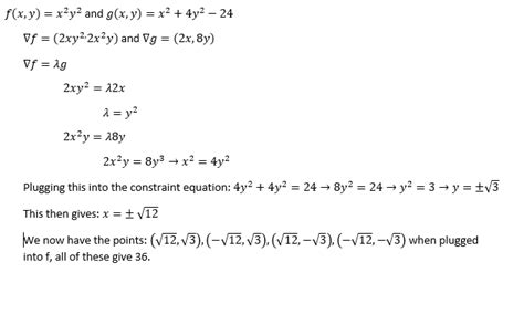 Now, solving this system of equations is where the algebra comes in. From (1), yz = λ(y + 2z) . From (2), xz = λ(x + 2z) . If we divide Equation 1 by Equation 2 (assuming x, y, z, λ are non-zero, which they must be for a box), we get yz / xz = (y + 2z) / (x + 2z) , which simplifies to y / x = (y + 2z) / (x + 2z) . Cross-multiplying gives y(x + 2z) = x(y + 2z) , so xy + 2yz = xy + 2xz . This simplifies further to 2yz = 2xz , meaning y = x . Aha! We’ve found a relationship between x and y . Now let’s use Equation 3: xy = λ(2x + 2y) . Since y = x , we can substitute x for y : x*x = λ(2x + 2x) , so x^2 = λ(4x) . This gives us x = 4λ (assuming x is not zero). From Equation 1, since y=x , xz - λ(x + 2z) = 0 . Substitute x = 4λ and y=x : (4λ)z - λ((4λ) + 2z) = 0 . Divide by λ (again, assuming λ is not zero): 4z - (4λ + 2z) = 0 . So, 4z - 4λ - 2z = 0 , which means 2z = 4λ . Therefore, z = 2λ . Now we have x = 4λ , y = 4λ (since y=x ), and z = 2λ . We can express x and y in terms of z : x = 2z and y = 2z . Finally, plug these relationships back into our constraint equation (Equation 4): (2z)(2z) + 2(2z)z + 2(2z)z = 108 . This simplifies to 4z^2 + 4z^2 + 4z^2 = 108 , so 12z^2 = 108 . Dividing by 12, we get z^2 = 9 , so z = 3 (since dimensions must be positive). With z = 3 , we find x = 2z = 2(3) = 6 and y = 2z = 2(3) = 6 . So, the dimensions of the box that maximize volume with a surface area of 108 are 6 x 6 x 3 . The maximum volume would then be V = xyz = 6 * 6 * 3 = 108 cubic units. This example clearly demonstrates how Lagrange Multipliers systematically lead us to the optimal dimensions under a specific constraint, making it a powerful tool for practical design and optimization challenges. Without it, finding these specific dimensions could be a much more arduous trial-and-error process, highlighting the real value of this mathematical technique in concrete scenarios.