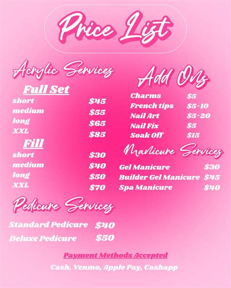 So, how do salons actually come up with these numbers? Let’s unpack the nails installation price structure you’ll often encounter. Most salons have a clear menu of services with corresponding prices. This is your starting point. You’ll see prices for a basic manicure, a gel manicure, acrylic full sets, fills, and maybe specialty services. The base price usually covers the fundamental service – applying the enhancement, shaping, and a standard polish color. What often adds to the final bill are the add-ons. These can include things like French tips, specific shapes (like coffin or stiletto), nail art, or using premium gel polishes. Some salons charge a flat rate for certain add-ons (e.g., + \(10 for French tips), while others might charge per nail or even by the complexity of the design, as we discussed. It’s also common to see tiered pricing based on nail length. Longer nails require more product and more time to sculpt and shape, so they often come with an additional charge, maybe \) 5-$15 more than shorter nails. Don’t forget about maintenance! The nails installation price for fills or refills is almost always less than the initial full set price because the technician isn’t starting from scratch. They’re primarily reshaping, filling the new growth, and rebalancing the nail. Some salons offer discounts for regular clients or package deals, especially if you book a series of appointments. It’s always a good idea to check the salon’s website or ask at the front desk about any ongoing promotions or loyalty programs. Also, be aware of tipping. While not strictly part of the installation price, it’s customary to tip your nail technician, usually 15-20% of the service cost, for good service. This is a separate cost to factor into your budget. Understanding these different components helps demystify the nails installation price and allows you to make informed decisions about the services you choose and the budget you set.
