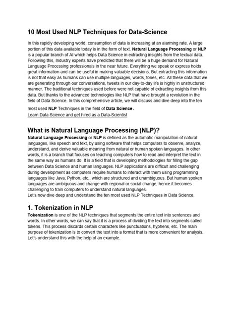 Tokenization is the process of breaking down a text into individual units called tokens. These tokens can be words, phrases, or even characters. For example, the sentence “Hello, how are you?” can be tokenized into the following tokens: “Hello”, “,”, “how”, “are”, “you”, “?”. Tokenization is a crucial step in NLP because it allows computers to process the text at a granular level. There are different tokenization techniques, such as word tokenization, sentence tokenization, and subword tokenization. The choice of tokenization technique depends on the specific NLP task and the characteristics of the text data.