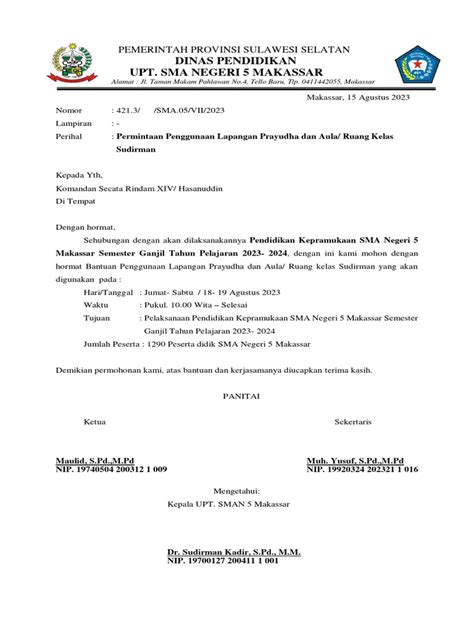 - Penutup: Bagian yang berisi ucapan terima kasih atas perhatian dan persetujuan dari pihak terkait.