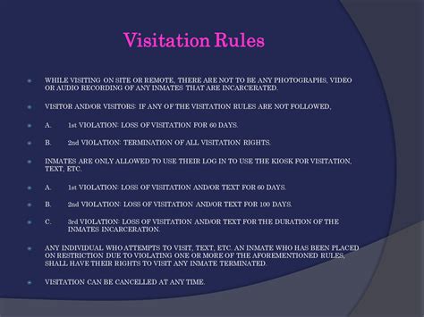1. * Communicate with the Offender: This is your absolute first step for anything related to visitation. Your loved one knows the specific rules of their unit better than anyone. They can tell you exactly what the visiting schedule is, who needs to be on the approved visitor list, any specific dress code nuances, and how to schedule. Don’t rely solely on generic information; get the specifics directly from them.