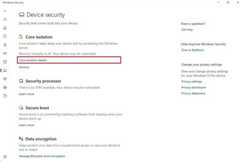 3. Find Core Isolation Details: Under the Device security section, you should see an option labeled Core isolation details . Click on that.